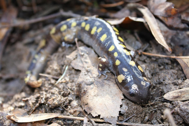 Salamanders on the other hand, do not have ear holes/openings. Look closely at the photo below and you will see that on the side of this animals' head, there is no opening. This animal below is a marbled salamander. Interesting, isn't? Look and see if the animal is lacking an ear opening, it could be a salamander.